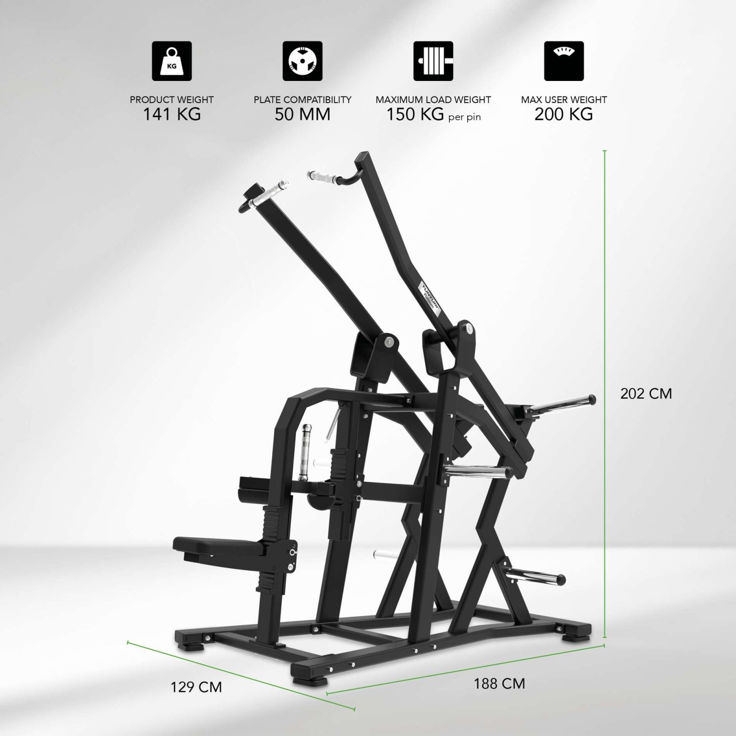 Mit plattenbelastetem Widerstand können Sie selbst wählen, wie viel Gewicht Sie verwenden möchten. Dank der geschmeidigen Mechanik und der soliden Konstruktion fühlt sich die Bewegung natürlich, flüssig und kraftvoll an. Durch die Verwendung von 50-mm-Hantelscheiben können Sie ohne die Einschränkungen fester Gewichtsblöcke progressiv aufbauen. Die Maschine ist bis zu 150 kg pro Stift belastbar und eignet sich daher sowohl für fortgeschrittene als auch für erfahrene Sportler, die maximale Kraftzuwächse anstreben.