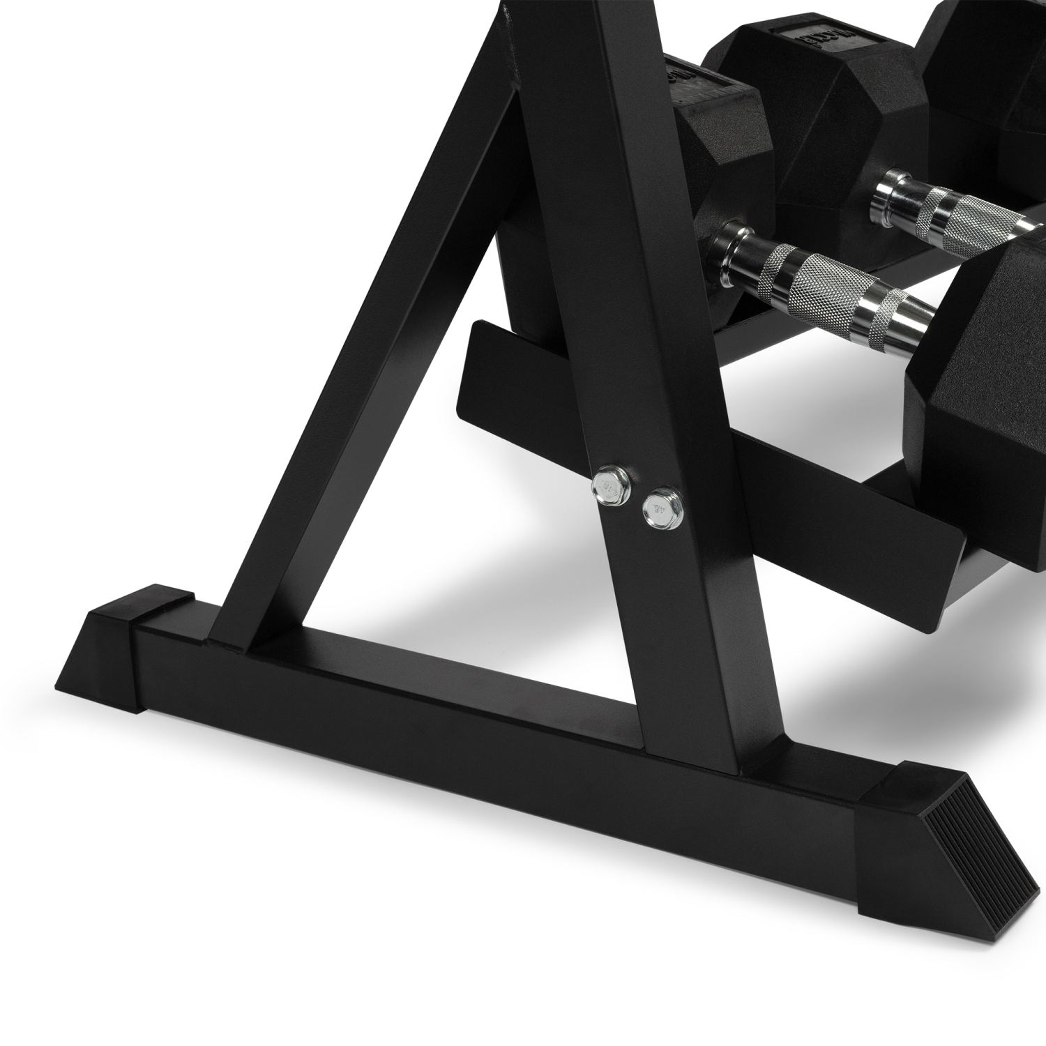 Mit seinen drei geräumigen Etagen bietet die Ablage genügend Platz, um eine große Anzahl von Hanteln sicher und bequem zu verstauen und für ein effizientes Training leicht zugänglich zu machen.