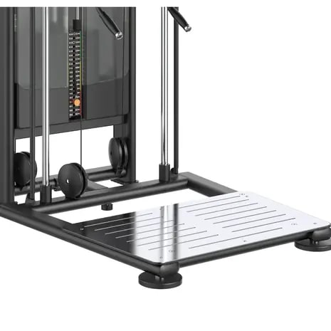 Das hochwertige Riemenscheibensystem aus POM-Material mit PREMIUM GRADE-Lagern garantiert einen reibungslosen und leisen Betrieb, während die starken Stahlseile (5 mm) einer maximalen Belastung von 1500 kg standhalten. Der 90 kg schwere Gewichtsblock mit Schutzkäfig sorgt für sicheren und gleichmäßigen Widerstand.